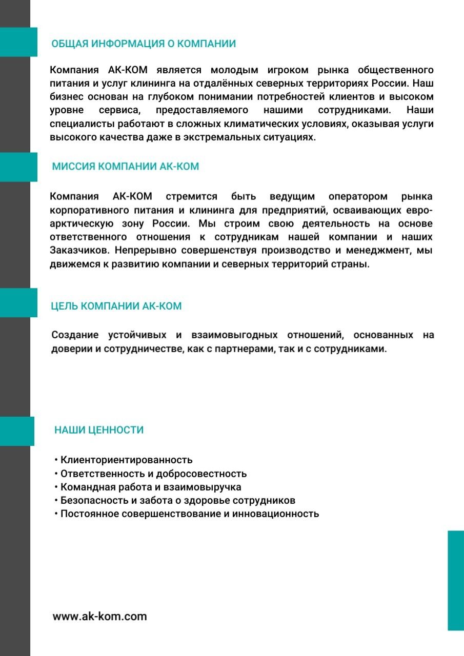 Компания «АК-КОМ» организует корпоративное питание и клининг. Наши клиенты – строительные и нефтегазовые компании, которые реализуют свои проекты на Крайнем Севере вдали от населенных пунктов.